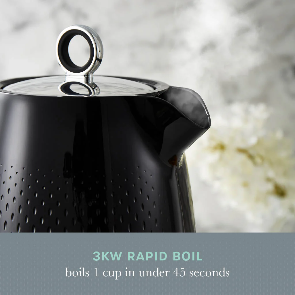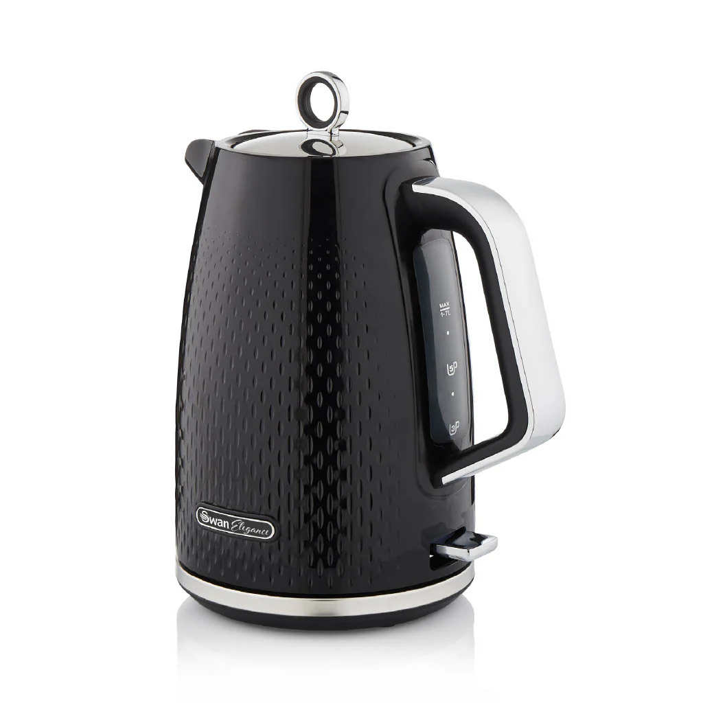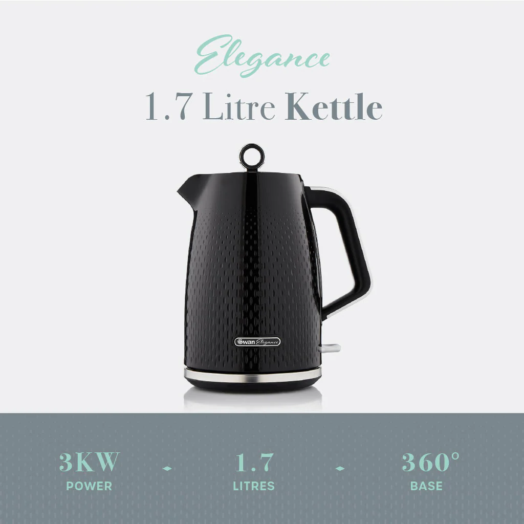 Nothing beats that first cup of coffee in the morning or winding down with a brew after a long day. This black kettle from the new Swan Elegance collection features a premium textured gloss finish to add style to your worktop. The cordless kettle features a large 1.7 litre capacity to make 7 cups on one boil, so you can entertain friends and family with hot chocolates, coffees and teas. Fancy a brew before your next meeting? The 3KW of power rapidly boils water for one cup in under 45 seconds. This Swan SK14016BLK Elegance electric kettle has been designed for convenience thanks to the pull up lid, providing a safe and hassle-free way to refill. Boil dry protection keeps your kettle from over boiling if there isn’t enough water, helping avoid damage. After boiling, the kettle switches off automatically for extra safety in family homes. Creating a nice warm drink has never been easier. The Swan Elegance collection’s distinctive design is the perfect addition if you are looking to freshen up your kitchen decor.