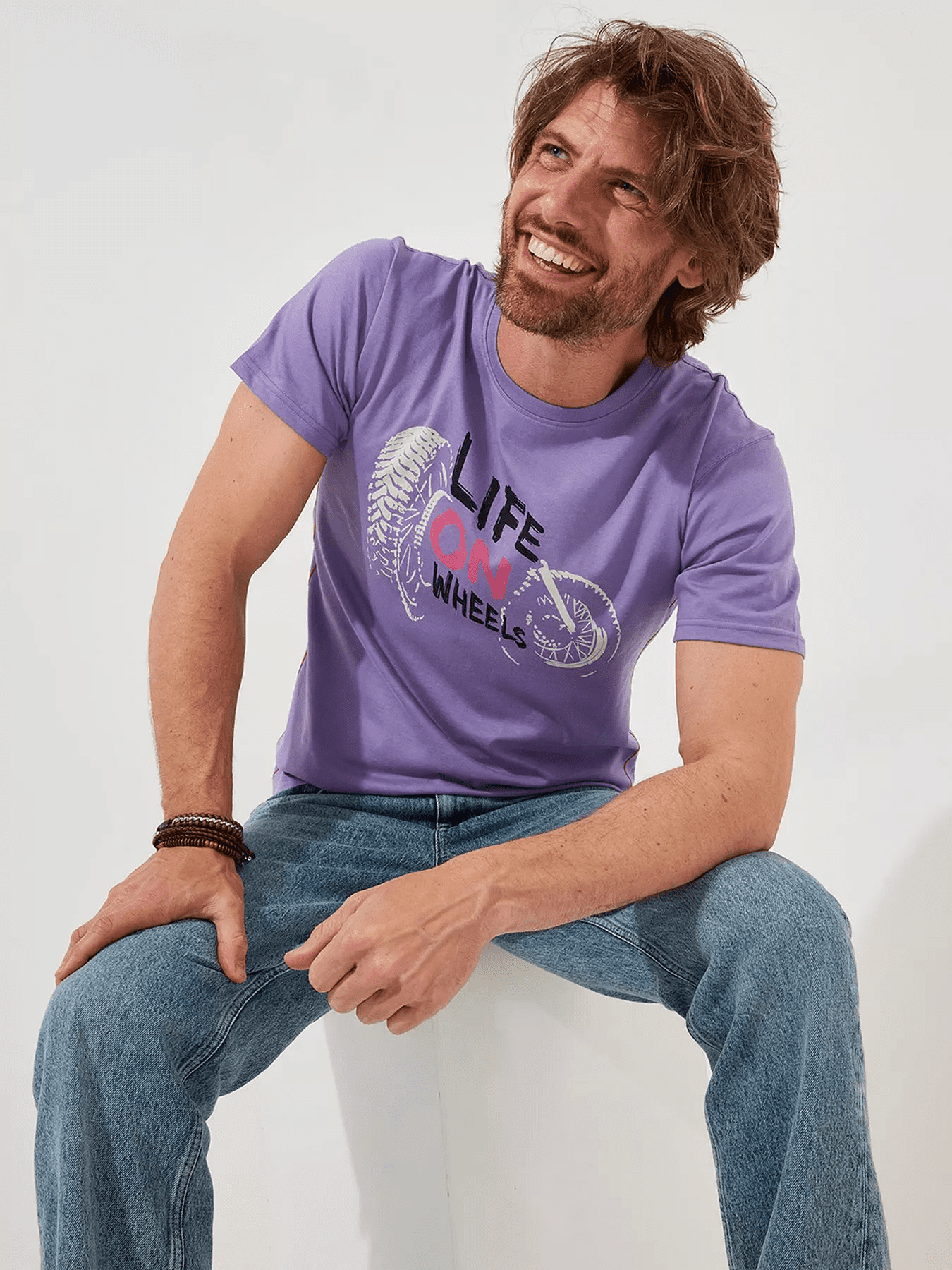 Softening an edgy graphic with purple fabric, this tee is for those who live life on wheels.