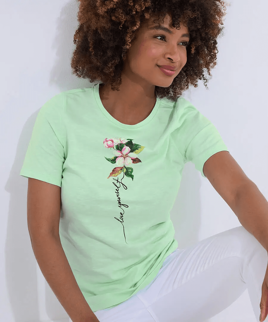 The classic jersey tee shirt with a summery take, thanks to a gorgeous mint green colour and beautiful floral graphic. Even better, the short sleeves and breathable fabric make it easy to wear in hot weather, so however you style it, you’ll always feel cool, comfy and cute.
